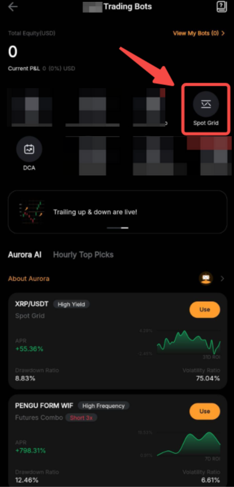 Используя стратегию ИИ, система предложит параметры, основанные на исторических данных по спотовой торговле. Вы также можете обратиться к предложению от Aurora’s Picks для создания Spot Grid Bot в зависимости от ваших предпочтений.