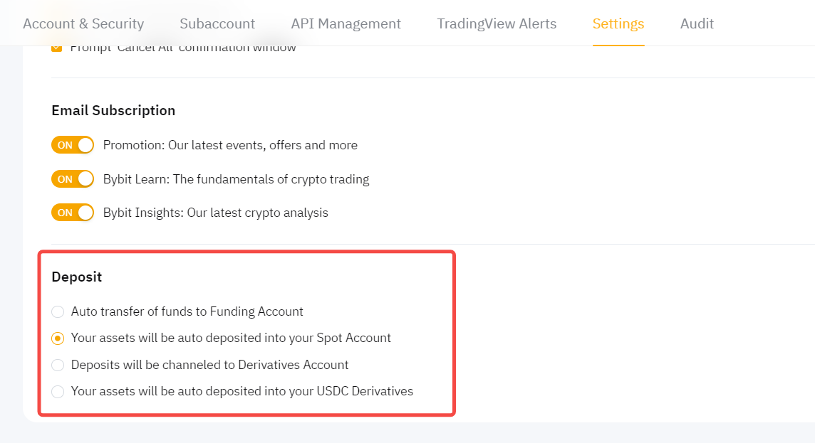 1. Выберите Автоперевод средств на спотовый аккаунт, деривативный аккаунт и другие.