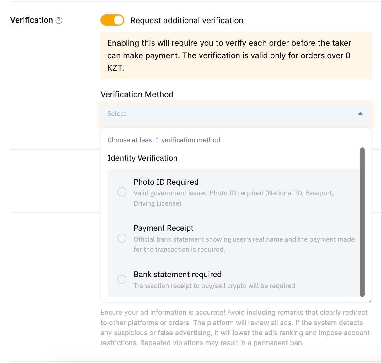 Когда требование к верификации включено рекламодателем, потребители должны выполнить верификацию с рекламодателем, когда заказ превышает указанный порог фиктивной валюты. Обе стороны имеют право решить, продолжать ли сделку в течение периода проверки в течение срока. Рекламодатели могут запросить у принимающей стороны следующее доказательство в Чате заказа: