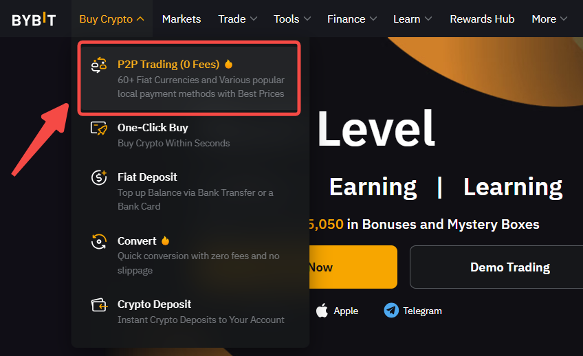 Шаг 1. Нажмите кнопку Купить криптовалюту → Торговля P2P в верхнем левом углу панели навигации, чтобы перейти на страницу торговли P2P.