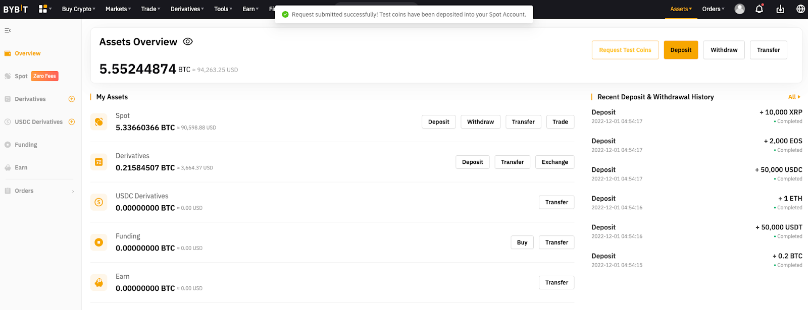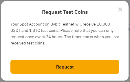 10 000 USDT и 1 BTC в тестовых монетах будут немедленно зачислены на ваш счет финансирования. Обратите внимание, что вы можете подать запрос только один раз в сутки. 24 часа начинаются с момента последнего получения тестовых монет.