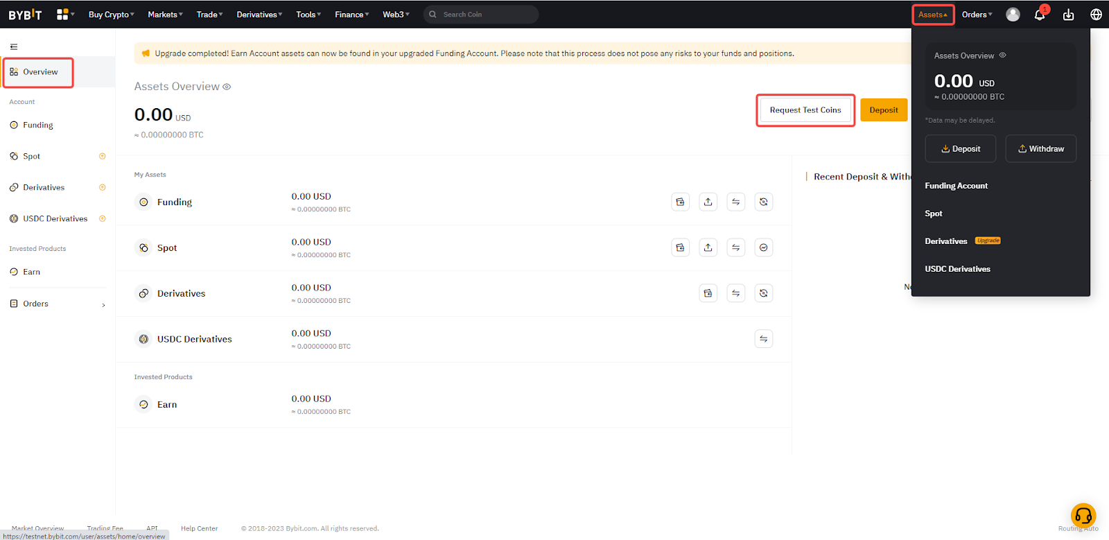 Шаг 1. Нажмите «Активы» → «Обзор активов» → «Запросить тестовые монеты»