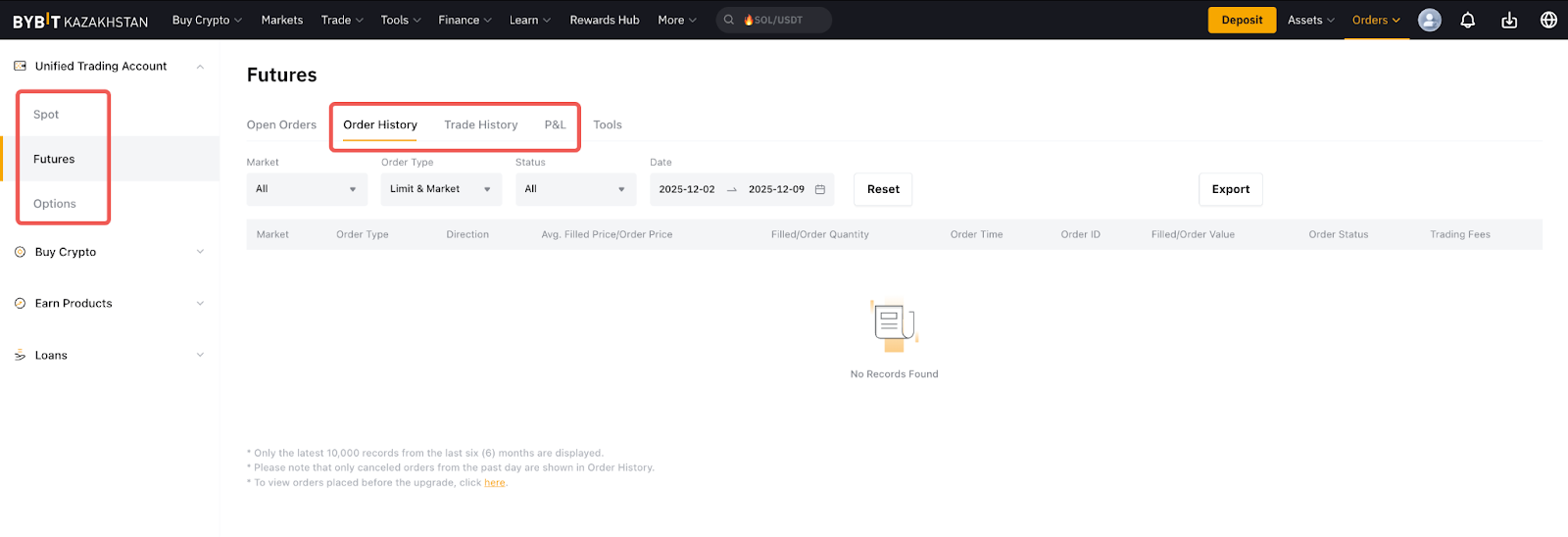 Шаг 1. Чтобы экспортировать данные истории для конкретного торгового продукта, перейдите на страницу Заказы → Единый торговый заказ на главной странице Bybit Kazakhstan.