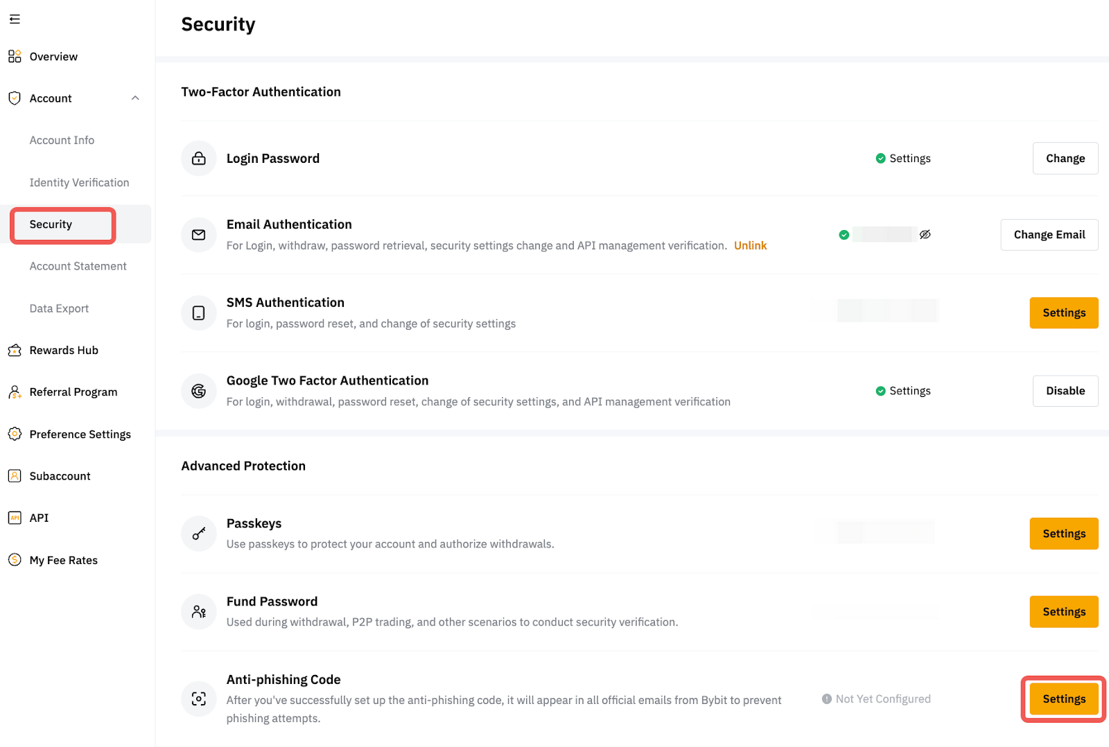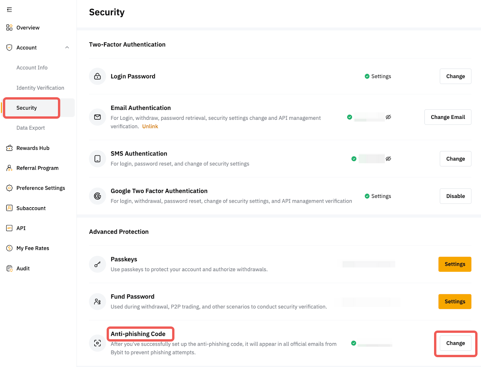 Чтобы изменить текущий код защиты от фишинга на Bybit Kazakhstan, нажмите Безопасность и затем кнопку Изменить в настройках кода защиты от фишинга.