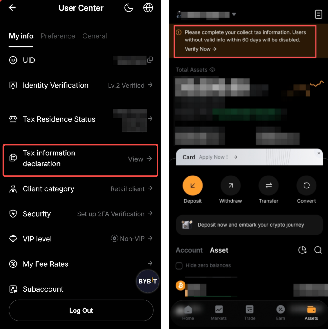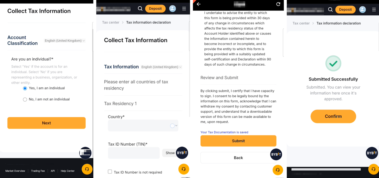 В целях соблюдения директивы ОЭСР о предоставлении отчетности о криптоактивах (CARF) пользователи обязаны предоставить налоговую идентификационную информацию на Bybit Казахстан для целей налоговой отчетности. Для отправки налоговой информации следуйте пошаговому руководству ниже.