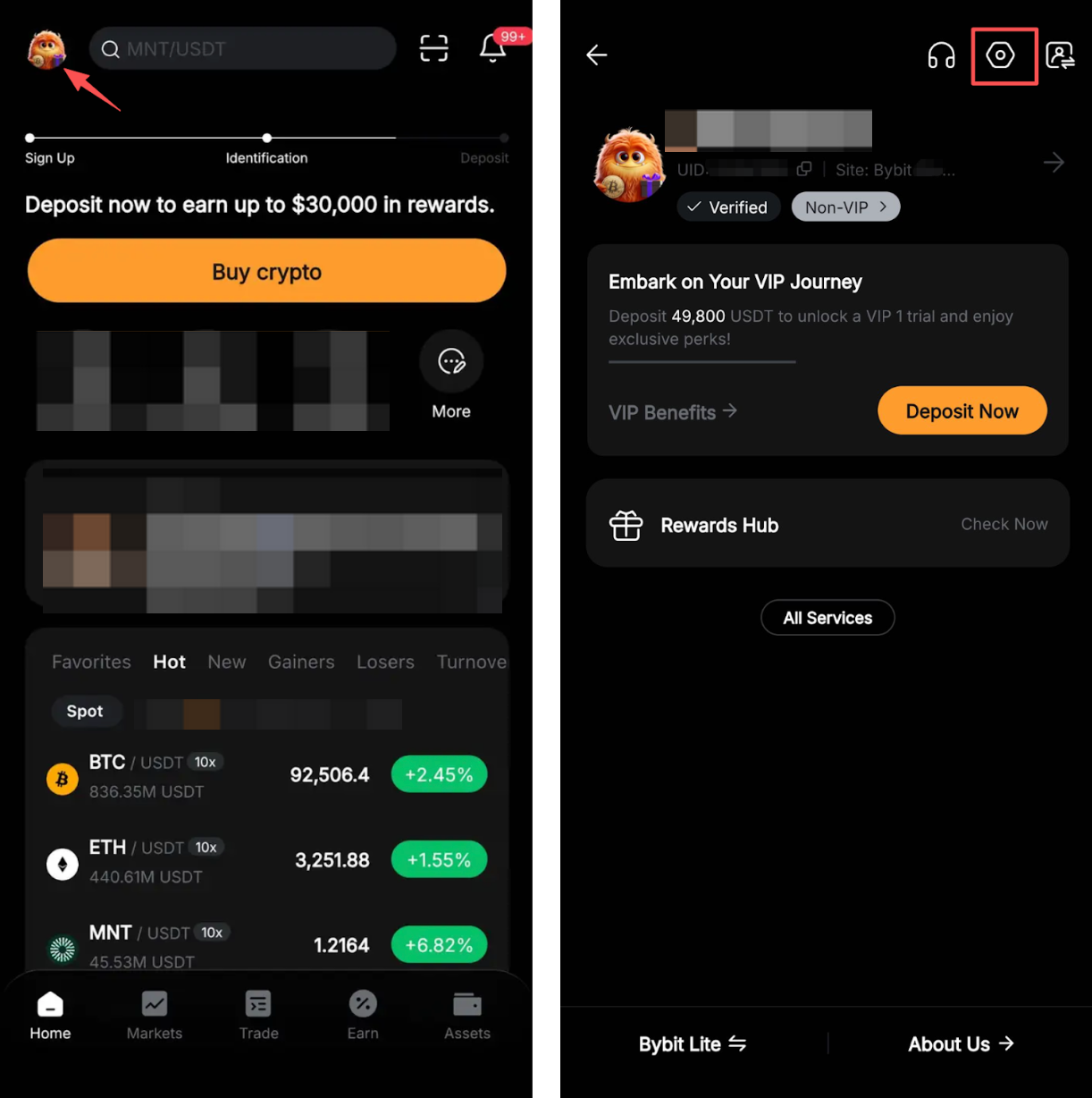 Шаг 1. Войдите в приложение Bybit Казахстан. Коснитесь значка профиля в верхнем левом углу, затем коснитесь значка настроек в верхнем правом углу.