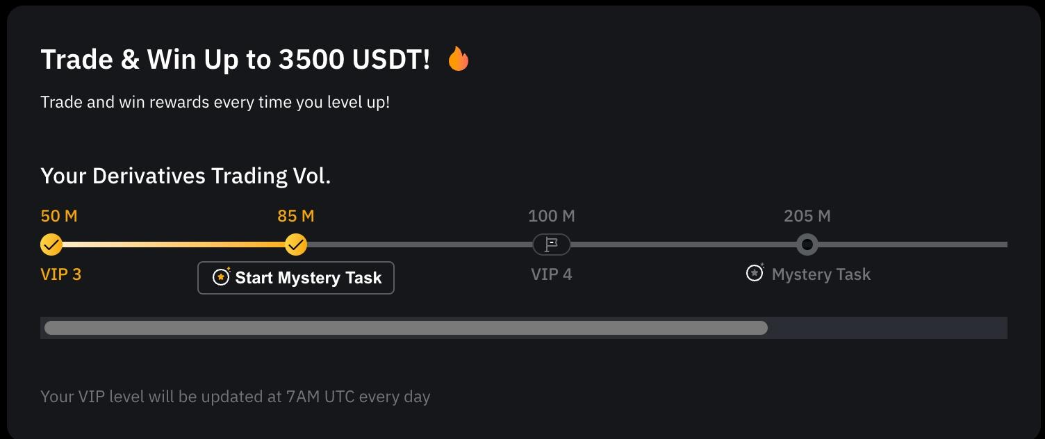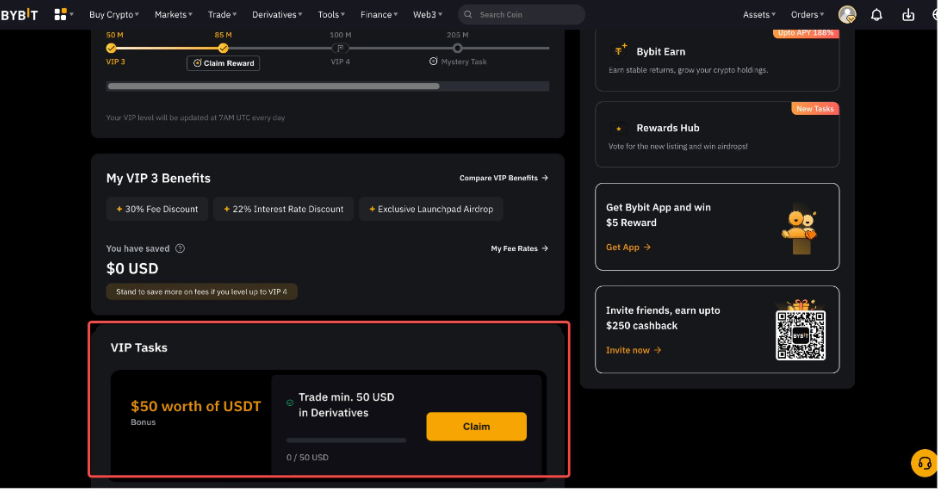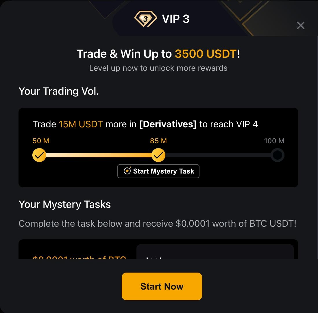 Войдите в свою учетную запись Bybit, и появится всплывающее окно, если вы имеете право на участие в VIP-задачах по повышению уровня. Нажмите «Начать сейчас».