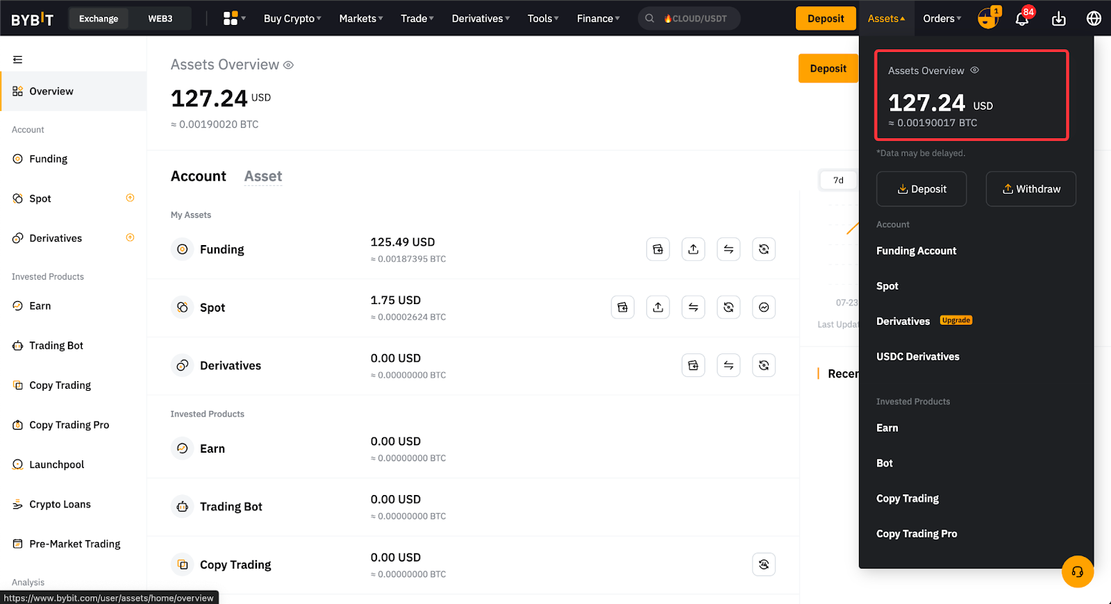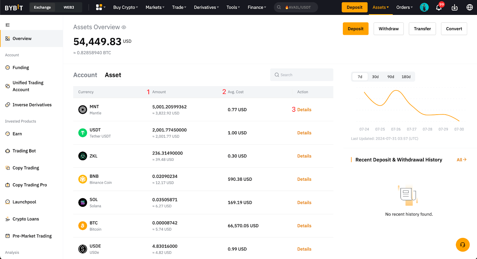 На странице с обзором активов можно посмотреть текущий баланс активов и их среднюю стоимость. Нажав кнопку Детали, можно посмотреть дополнительные ключевые показатели, например совокупный показатель P&L в USD и (%) и текущую индексную цену активов.