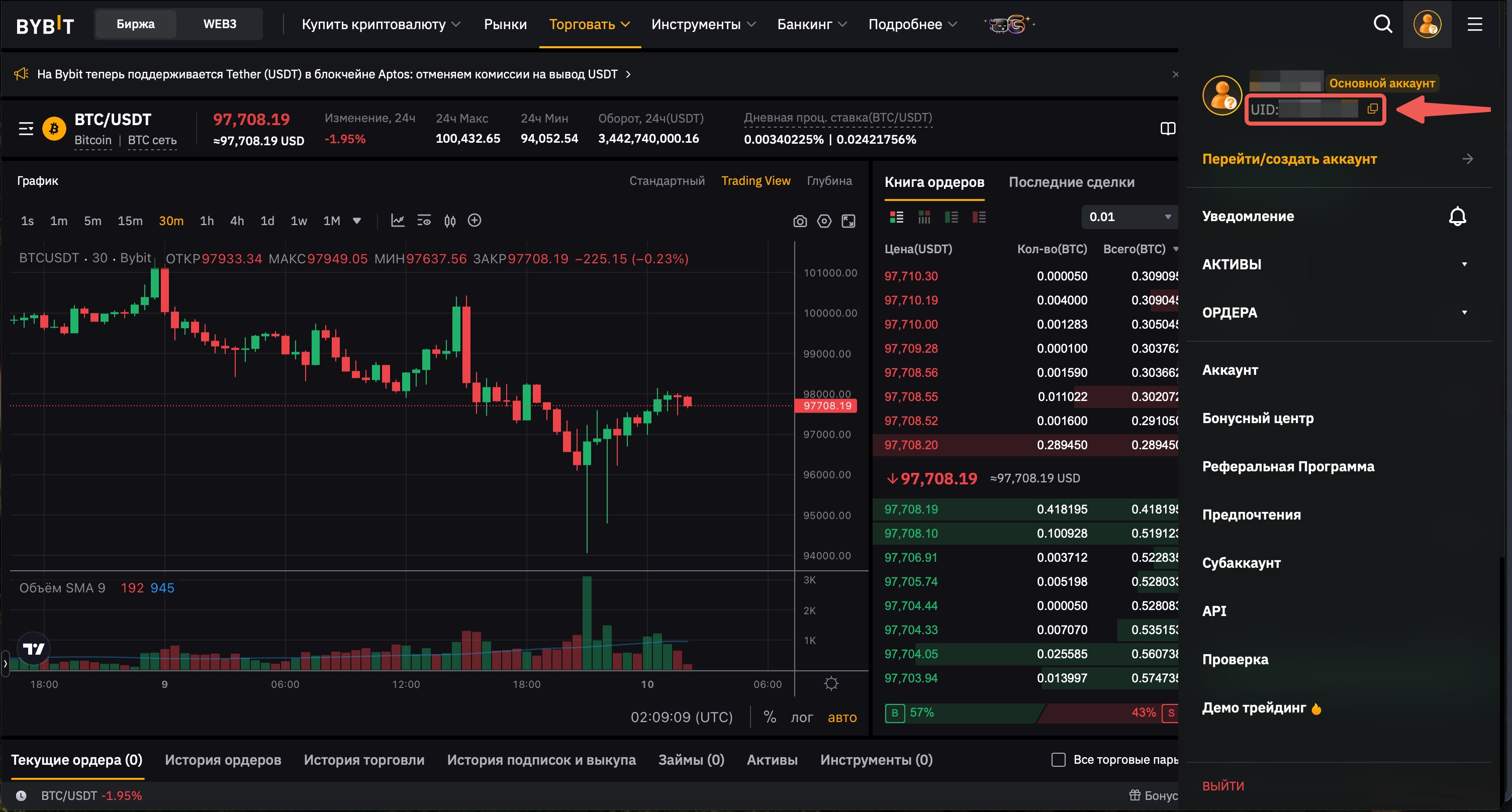 Способ 2. В правом верхнем углу любой веб-страницы Bybit Kazakhstan наведите курсор на значок «Профиль», и вы сможете увидеть свой UID в выпадающем меню.
