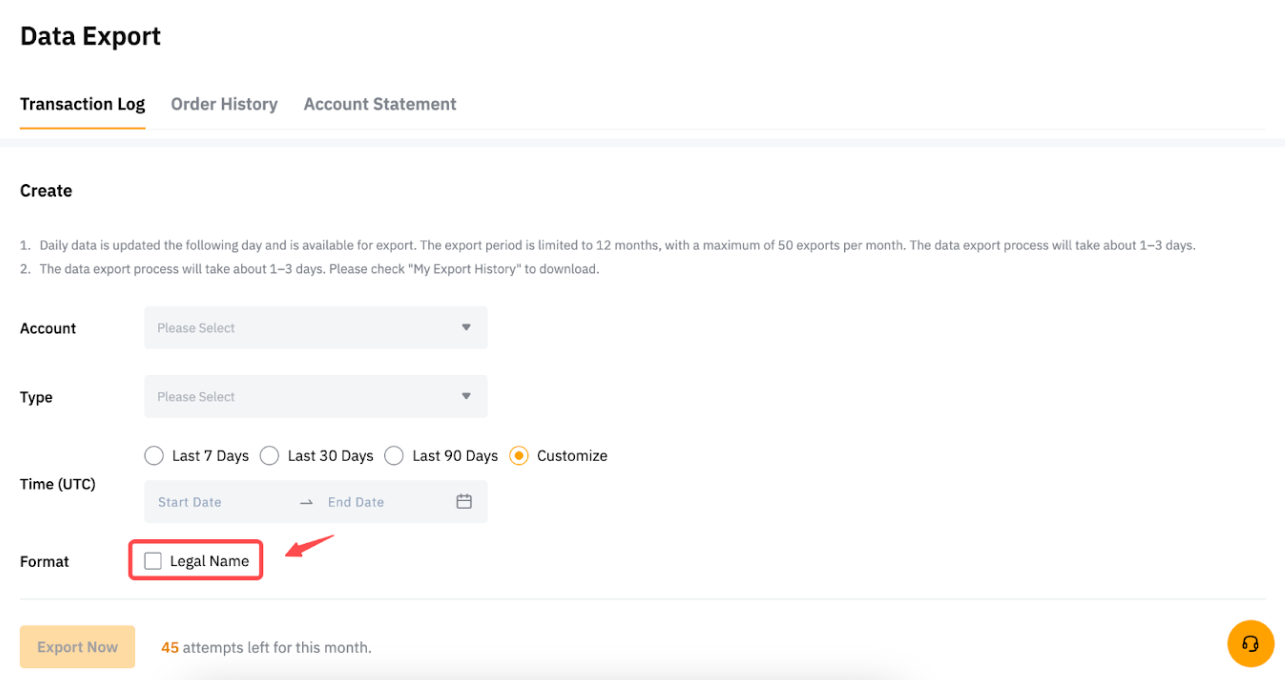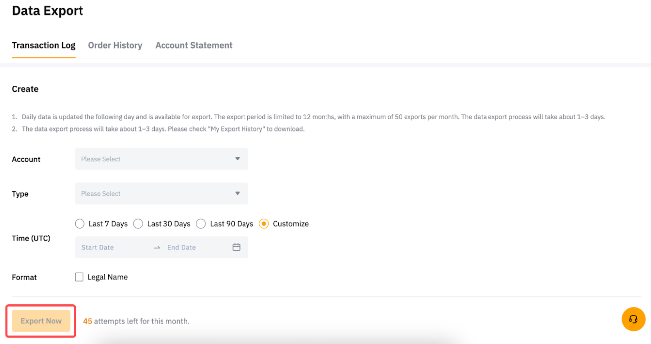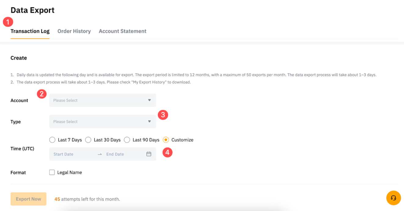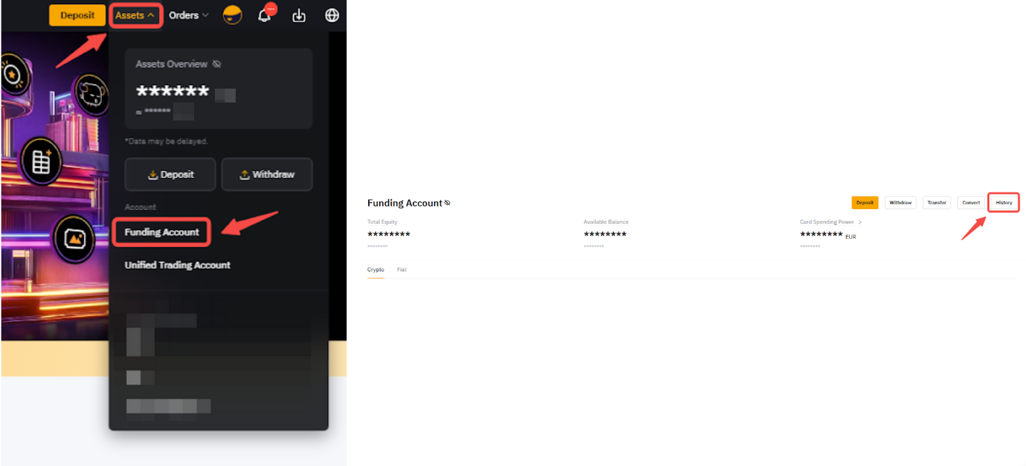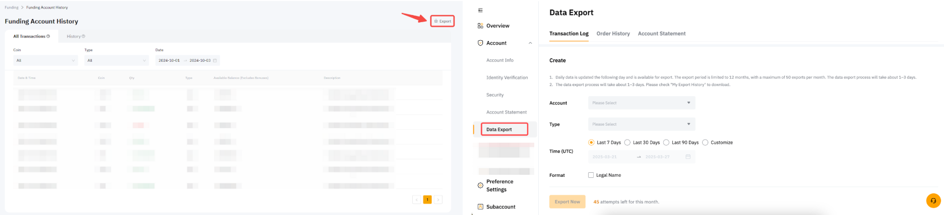 Шаг 1. нажмите Активы → Аккаунт Финансирования → История → Экспорт или перейдите на страницу Экспорт данных.