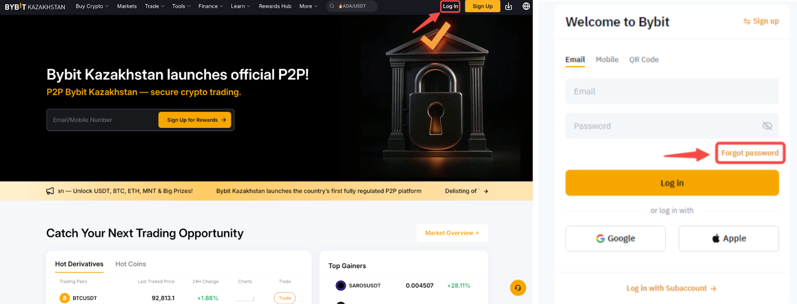 Шаг 1. На Главной странице Bybit Kazakhstan, нажмите Войти. На странице входа нажмите Забыли пароль.
