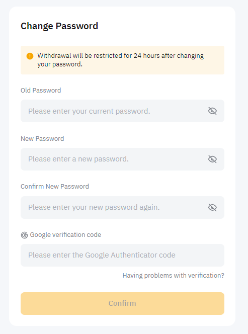 Введите старый пароль, новый пароль и код подтверждения Google и нажмите Подтвердить, чтобы восстановить пароль. В качестве меры безопасности вы будете выведены из аккаунта и для входа в систему вам потребуется использовать новый пароль.
