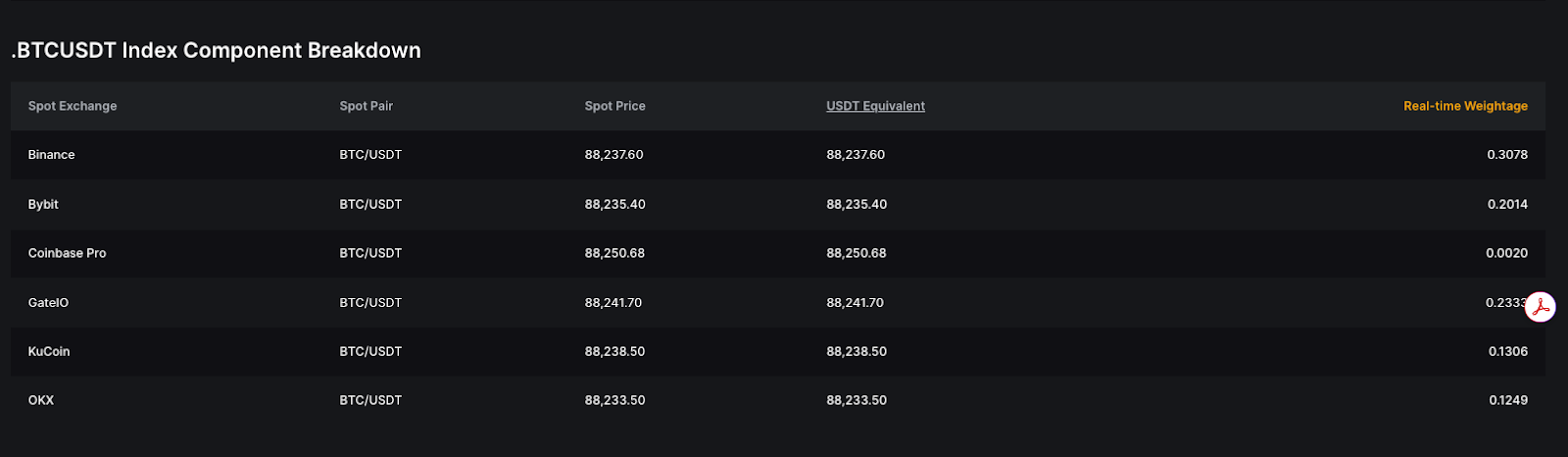 Индексная цена зависит от трёх (3) переменных: Спотовая цена, Эквивалент в паре с USDT и Вес в реальном времени.