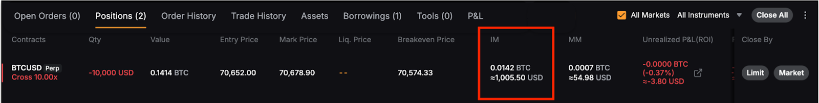 Обратите внимание, что начальная маржа, указанная на вкладке позиции, включает комиссию тейкера, которая может взиматься при закрытии позиции.