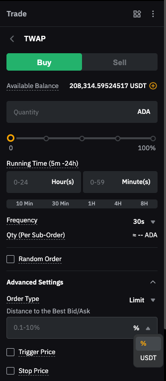 Шаг 2. Создайте ордер на TWAP, указав параметры.