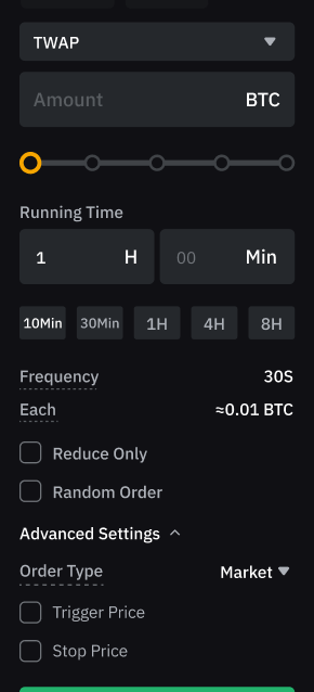 - Каждый аккаунт может поддерживать одновременно 20 стратегий TWAP, а каждая торговая пара может одновременно открывать максимум десять (10) стратегий TWAP.
