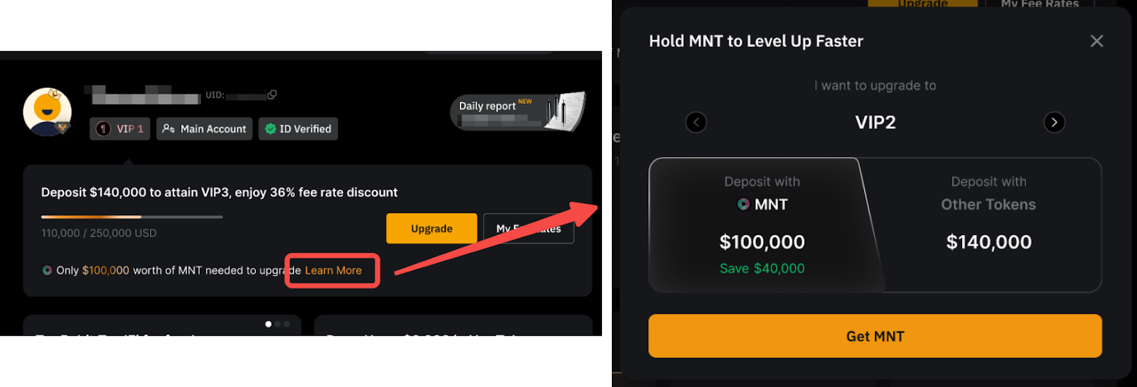 Множитель 1,5× применяется к вашим MNT, увеличивая их стоимость до $97 500 ($65 000 × 1,5). Прибавление 30 000 USDT даёт общую стоимость активов $127 500, что позволяет вам получить VIP 1.