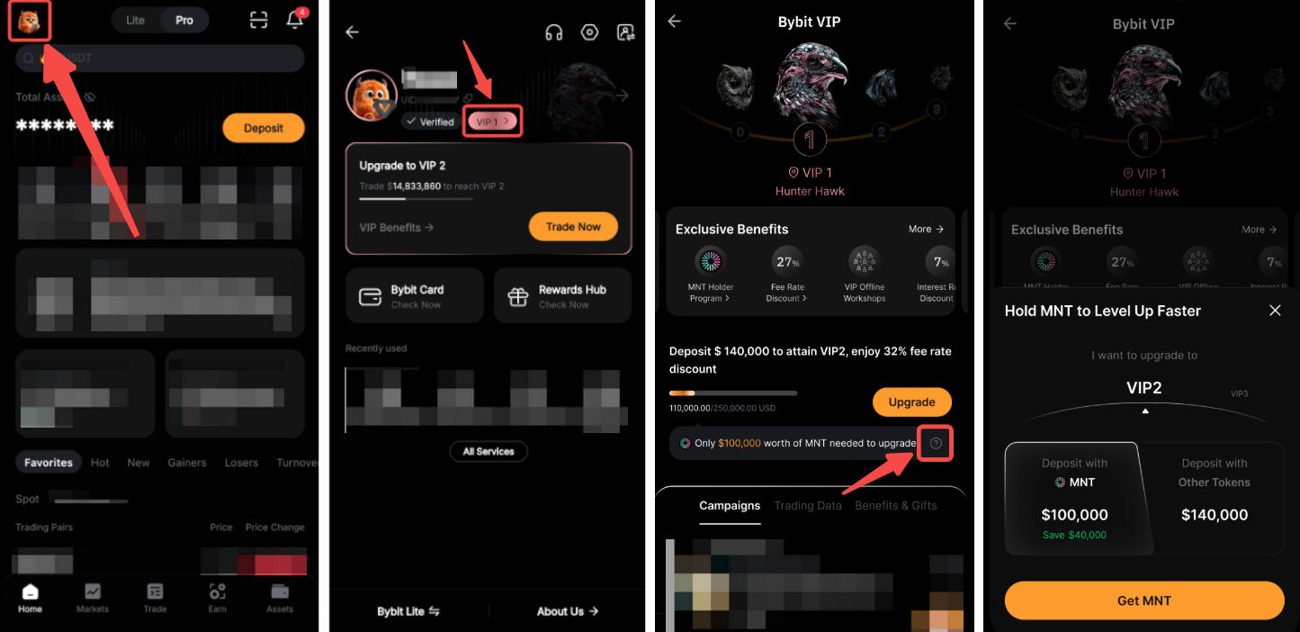 Если вы используете приложение, нажмите на изображение своего профиля в левом верхнем углу, затем выберите свой VIP-уровень. Затем нажмите на значок вопроса рядом с надписью «Для повышения уровня требуется еще $ {определенная сумма} в MNT», чтобы узнать, сколько ещё нужно внести для повышения уровня.
