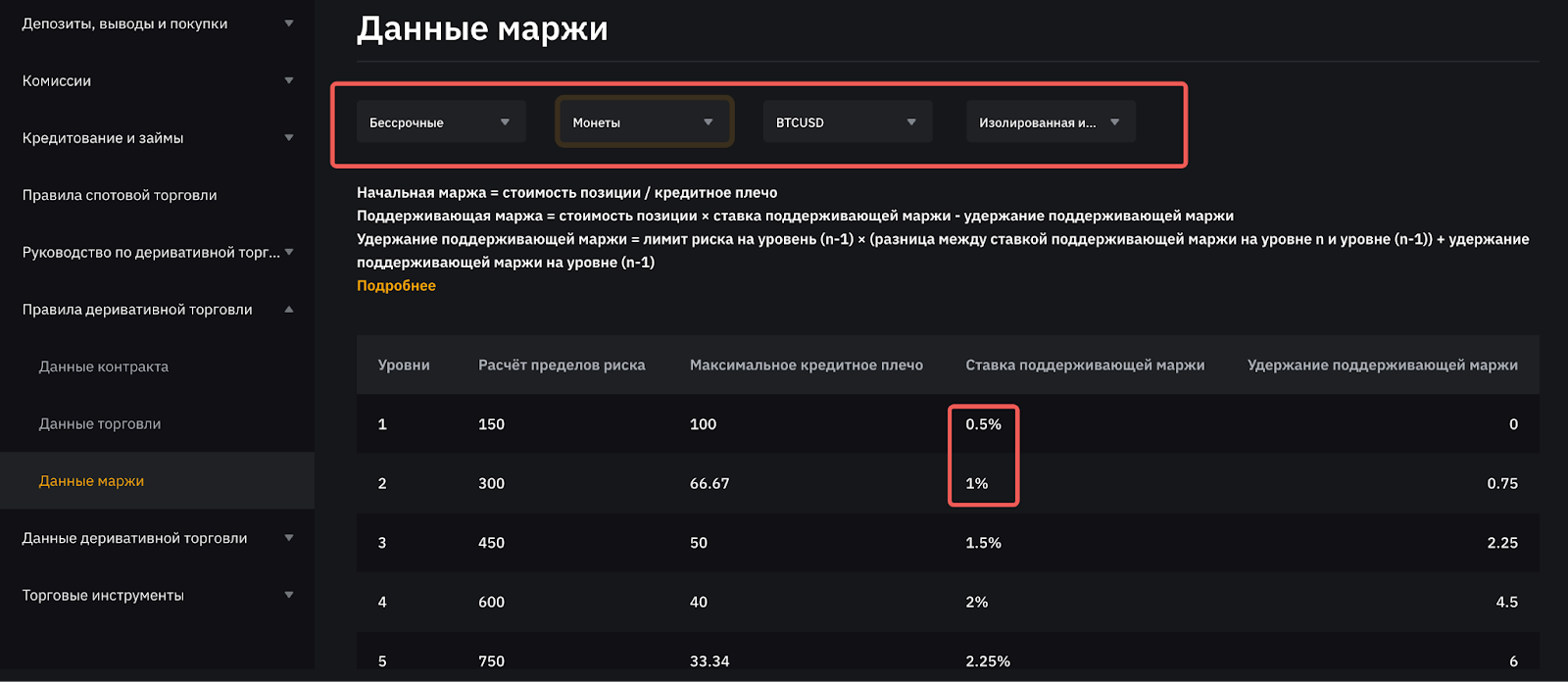 Например, при открытии позиции BTCUSD со стоимостью позиции 150 BTC или ниже ставка поддерживающей маржи, необходимая для позиции, составляет 0,5% от значения позиции. Если стоимость позиции вырастет до 300 BTC, необходимая Ставка поддерживающей маржи также вырастет до 1% от стоимости позиции.