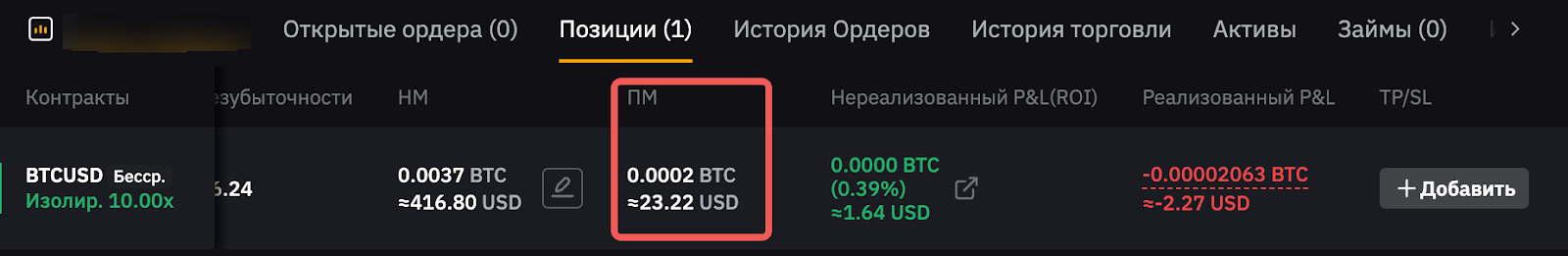 Вы можете заметить, что ПM, отображаемая на вкладке позиции, будет выше по причине того, что она включает расчётную комиссию за закрытие позиции.