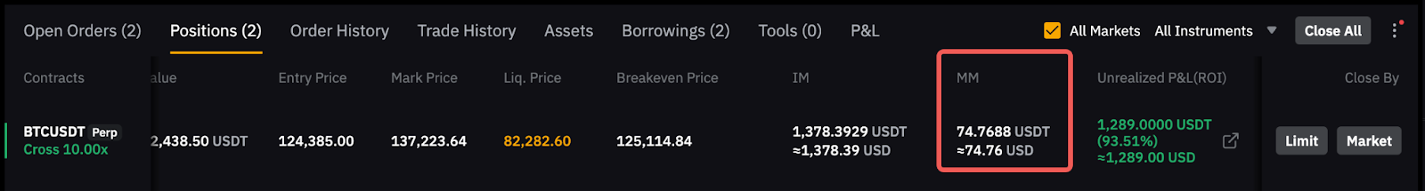 В этом случае общая поддерживающая маржа, отображаемая на вкладке позиции, составит 11 242 USDT (11 000 USDT + 242 USDT).