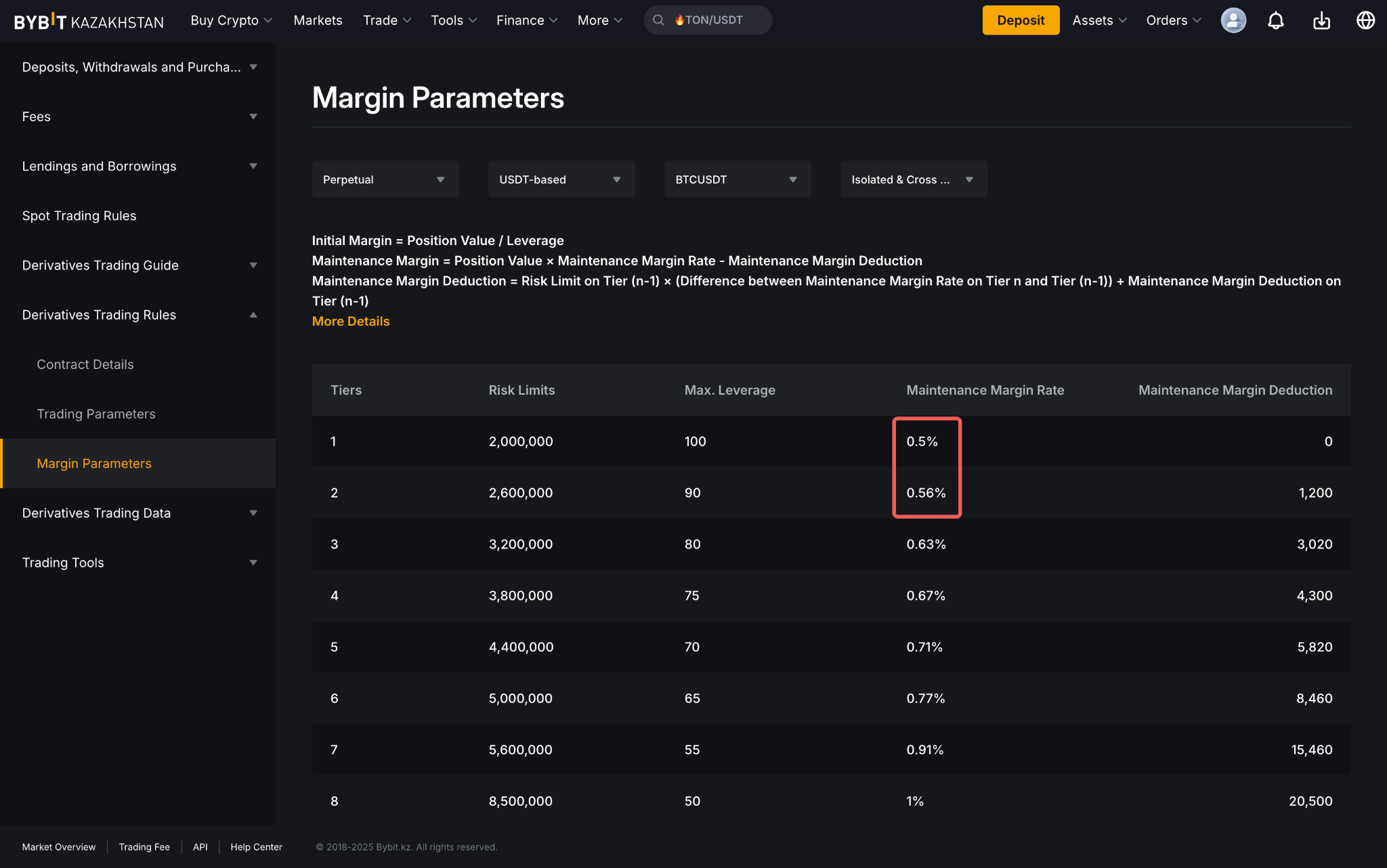 Ставка поддерживающей маржи для каждой позиции определяется путём расчёта на основе уровней в соответствии с уровнем маржи и стоимостью позиции. Любое превышение определённого уровня подлежит расчёту на основе ставки поддерживающей маржи для нового уровня.
