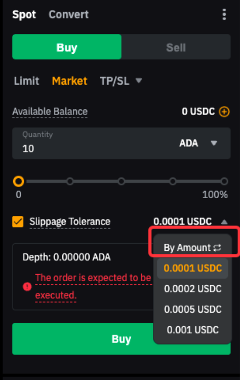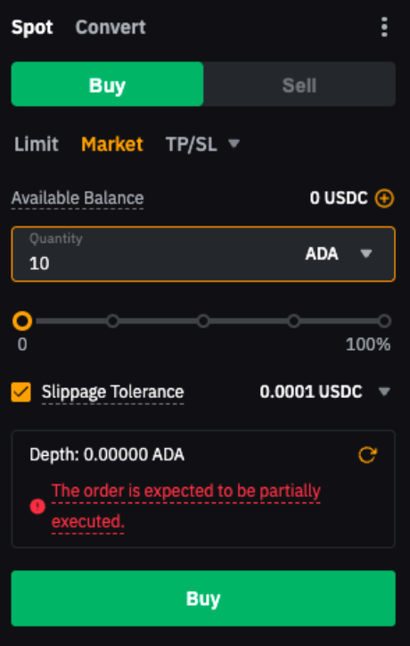 — Фактическое исполнение зависит от размера ордера и глубины рынка, поэтому нет гарантии полного исполнения. Если глубины рынка не хватает для полного исполнения ордера, будет исполнена только та часть, которая находится в пределах допустимого проскальзывания, а любая сумма, выходящая за пределы, будет отменена.