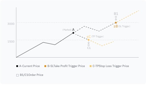 Цена срабатывания (C) для ордера на продажу на нижнем лимите (Стоп Лосс) должна быть ниже текущей рыночной цены, а цена срабатывания (B) для ордера на продажу на верхней границе (Тейк Профит) должна быть выше текущей рыночной цены. |