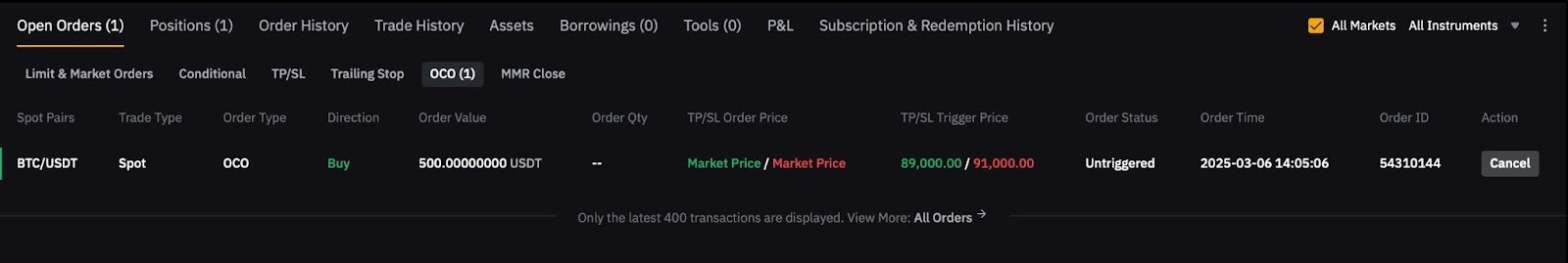 Вы можете просмотреть свои ожидающие ордеры OCO, перейдя на вкладку Открытые ордера и проверив выполненные или отмененные ордеры OCO на вкладке История ордеров.
