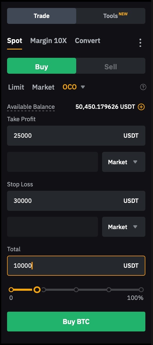 Исключительно для Спотовых и Спот-Маржинальных трейдеров: Ордера OCO доступны только пользователям, занимающимся Спотовой или Спотовой Маржинальной торговлей.
