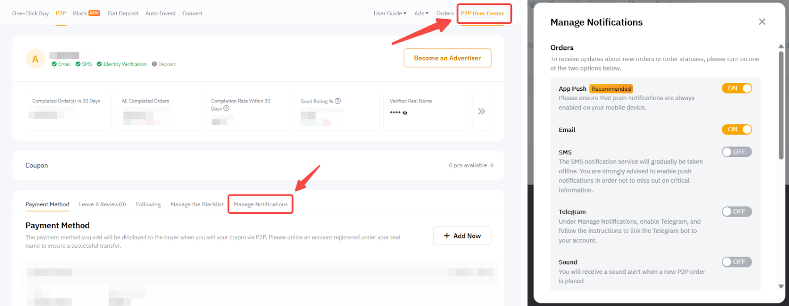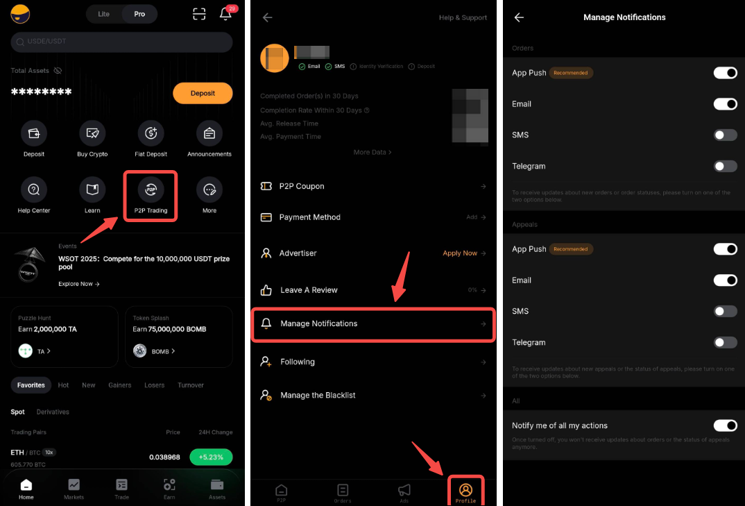 Вы можете управлять уведомлениями, такими как App push, Telegram, электронная почта и SMS для заказов и апелляций P2P через центр пользователей P2P.