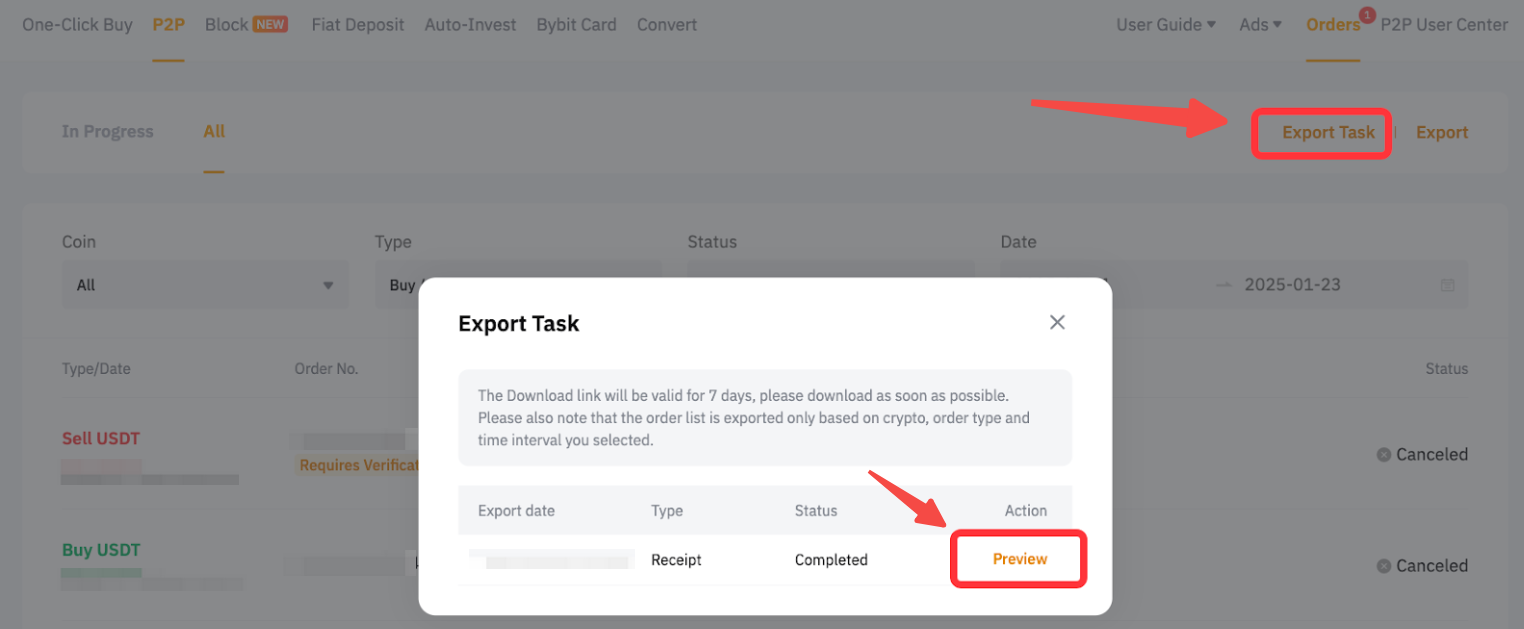 Да, вы можете загрузить квитанцию заказа P2P, нажав «Квитанция» на странице «Список заказов». Функция загрузки доступна для завершенных заказов, а квитанции можно загрузить только с веб-сайта Bybit в Казахстане.