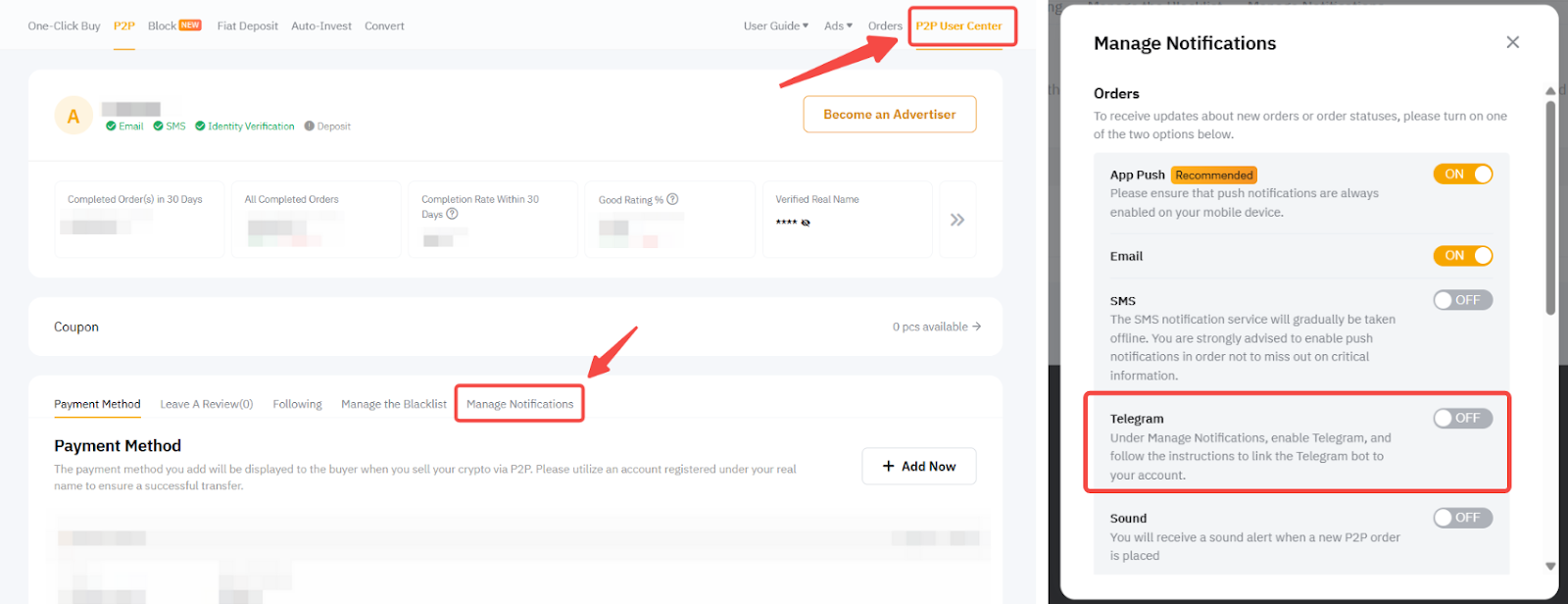 1. Перейдите на страницу Центра пользователей P2P, нажмите Управление уведомлениями, чтобы включить уведомления Telegram, следуйте подсказкам на странице, чтобы завершить привязку, и добавьте Бот в качестве контакта.
