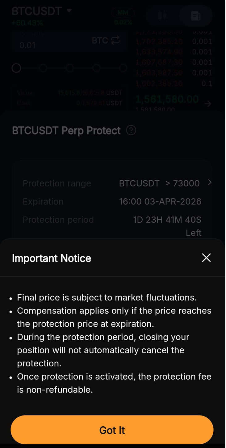 Перед покупкой ордера Perp Protect обратите внимание на следующее: