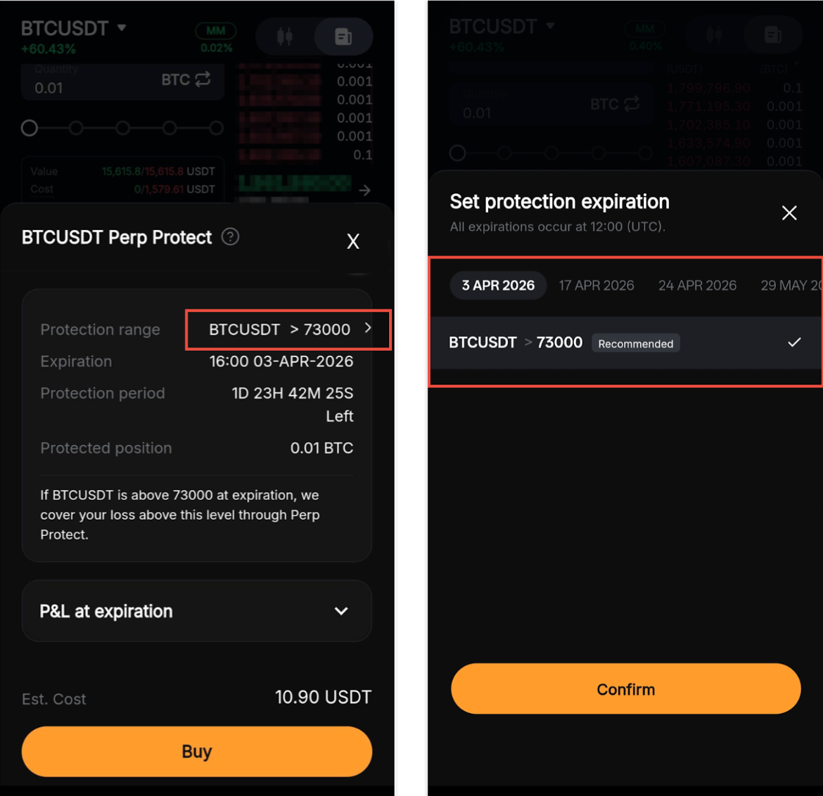Для лонг-позиции Perp Protect работает путём покупки пут-опционов, а для шорт-позиции — путём покупки колл-опционов. Эти опционы имеют заранее определённую страйк-цену и дату истечения, а также соответствуют количеству вашей позиции по бессрочному контракту.
