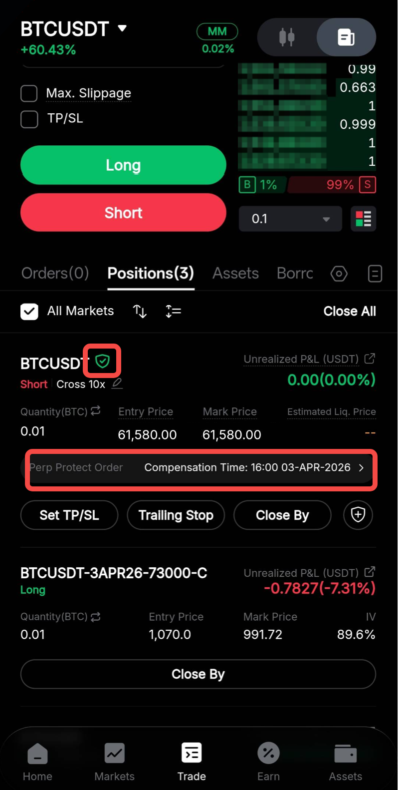 Чтобы просмотреть подробности, нажмите на зелёный щит рядом с соответствующей бессрочной позицией или перейдите непосредственно к опционному контракту Perp Protect.