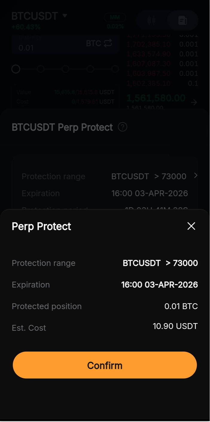 Проверьте информацию об ордере Perp Protect, а затем нажмите Подтвердить.