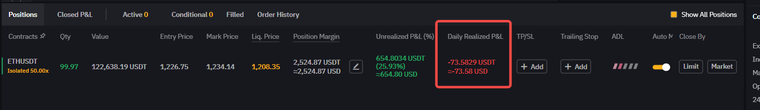 Реализованный P&L можно найти на вкладке позиции, и она показывает сумму Реализованных P&L позиции за определенный период. Сюда входят все торговые комиссии, комиссии за финансирование и любые прибыли и убытки позиции, полученные в результате частичного закрытия (та же формула, что и для Нереализованных P&L).