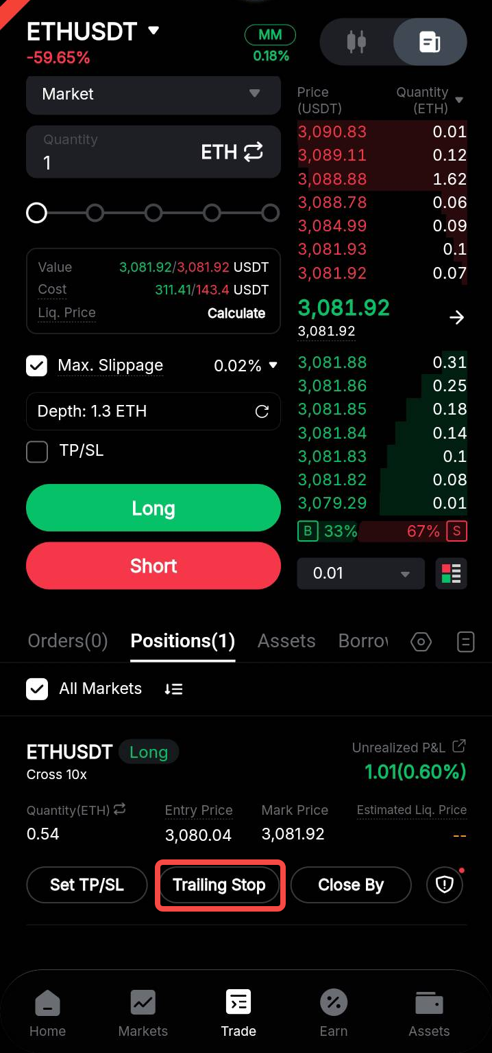 Шаг 1. Перейдите к своей открытой позиции на странице бессрочной торговли и торговли фьючерсами и нажмите на кнопку Trailing Stop.