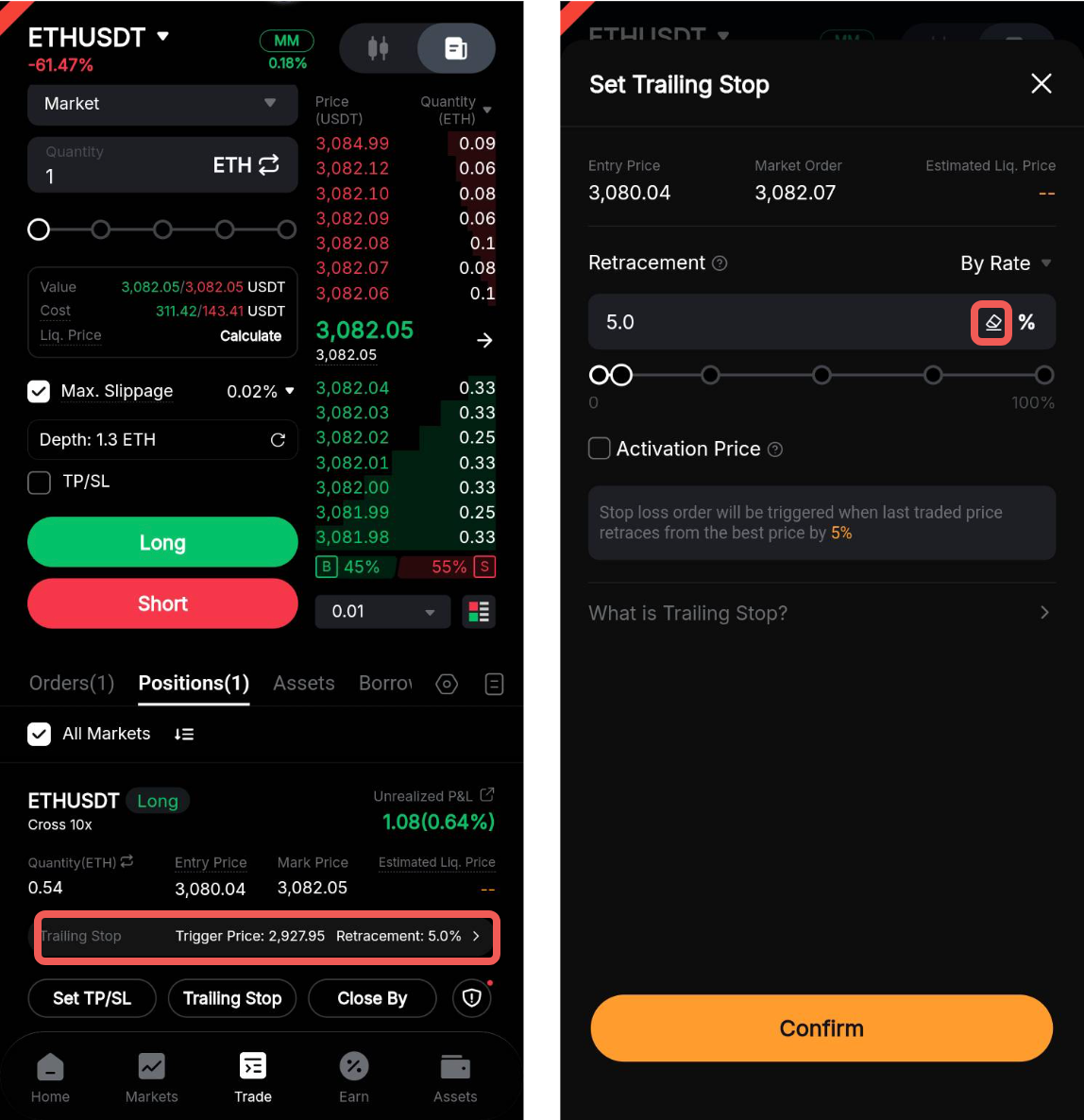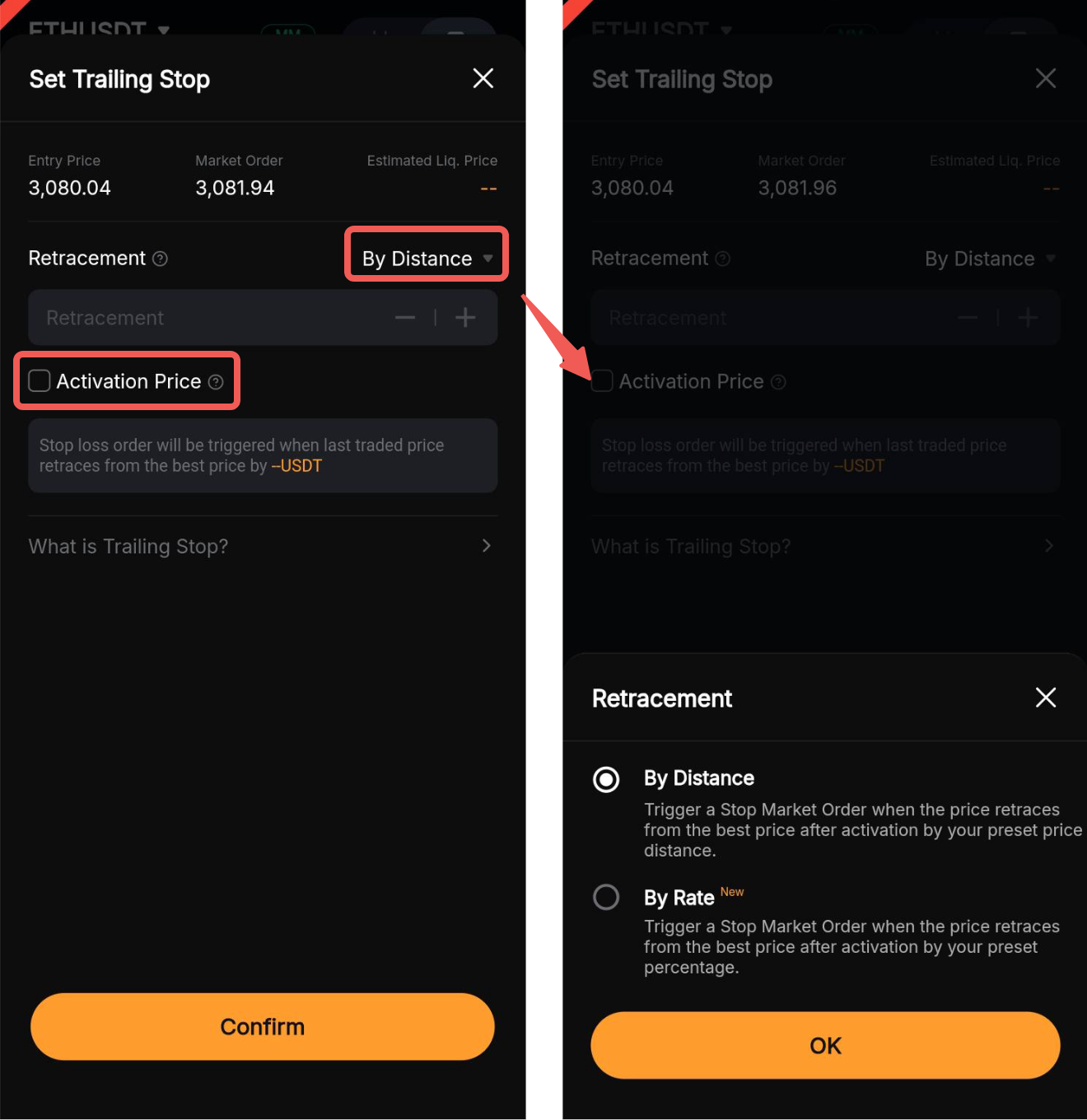 Шаг 2. Выберите метод триггера слежения (по скорости или расстоянию) и при необходимости задайте цену активации. Затем нажмите «Подтвердить».