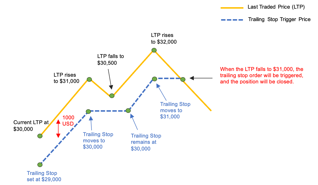 - Если последняя торгуемая цена поднимется до 31 000 долл. США, цена Trailing Stop автоматически поднимется на 1 000 долл. США (с учетом корректировок расстояния до возврата, разрешенных на каждые 0,5 долл. США), и Trailing Stop будет инициирован на 30 000 долл. США.