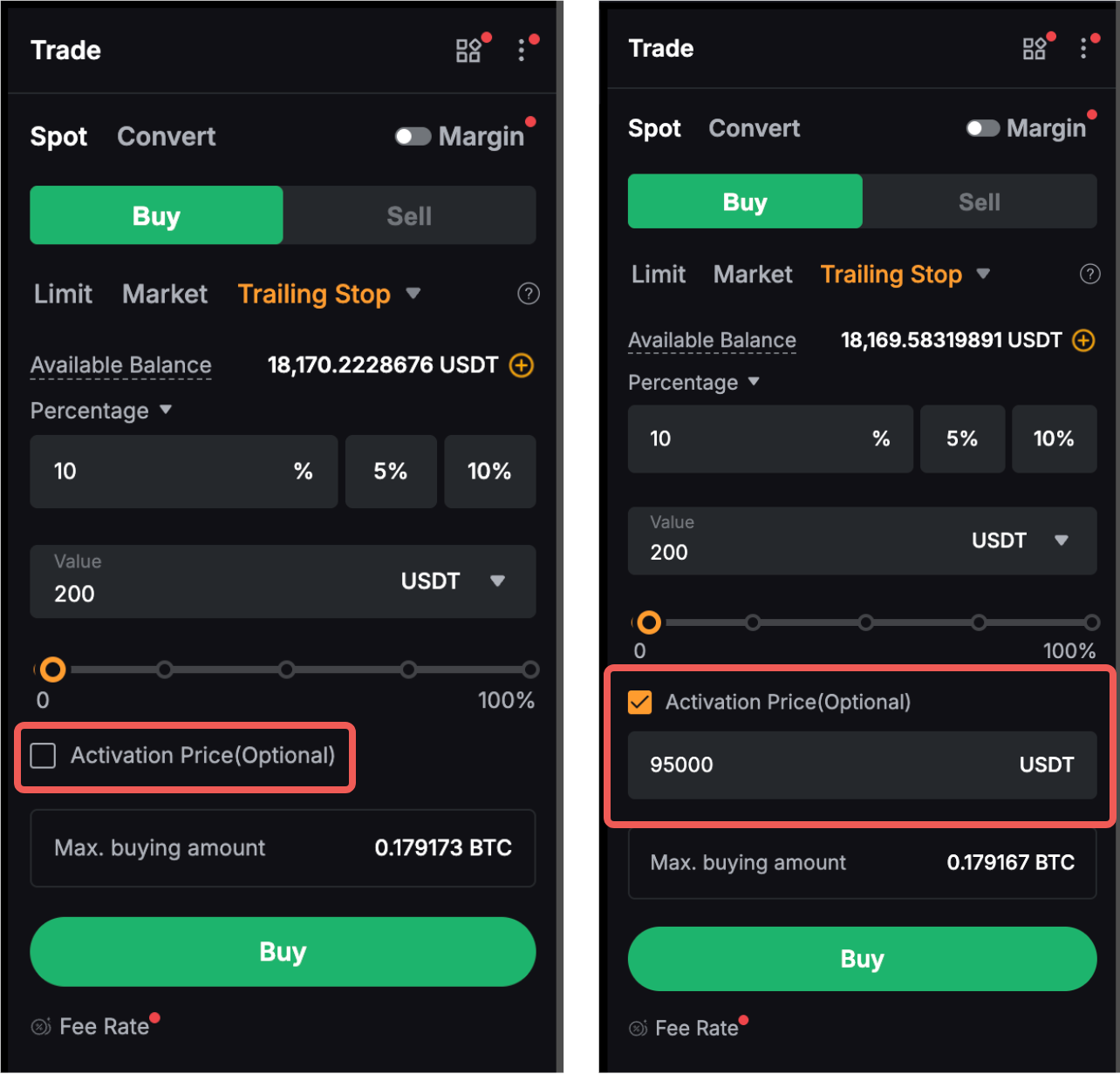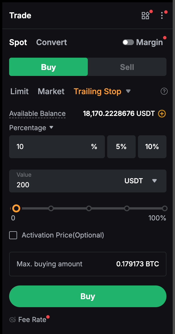 Trailing Stop in Spot и Margin — это динамический тип заказа, который функционирует как расширенная функция для покупки и продажи. Он действует как стоп-приказ, который отслеживает рыночную цену актива или позиции и автоматически корректирует стоп-приказ, чтобы свести к минимуму убытки или блокировать прибыль по мере изменения цены в пользу трейдера. После определения хвостовой остановки, если рыночная цена достигнет определенного уровня, а затем будет отслежена на заранее определенную сумму, установленную пользователем, будет инициирован рыночный заказ.