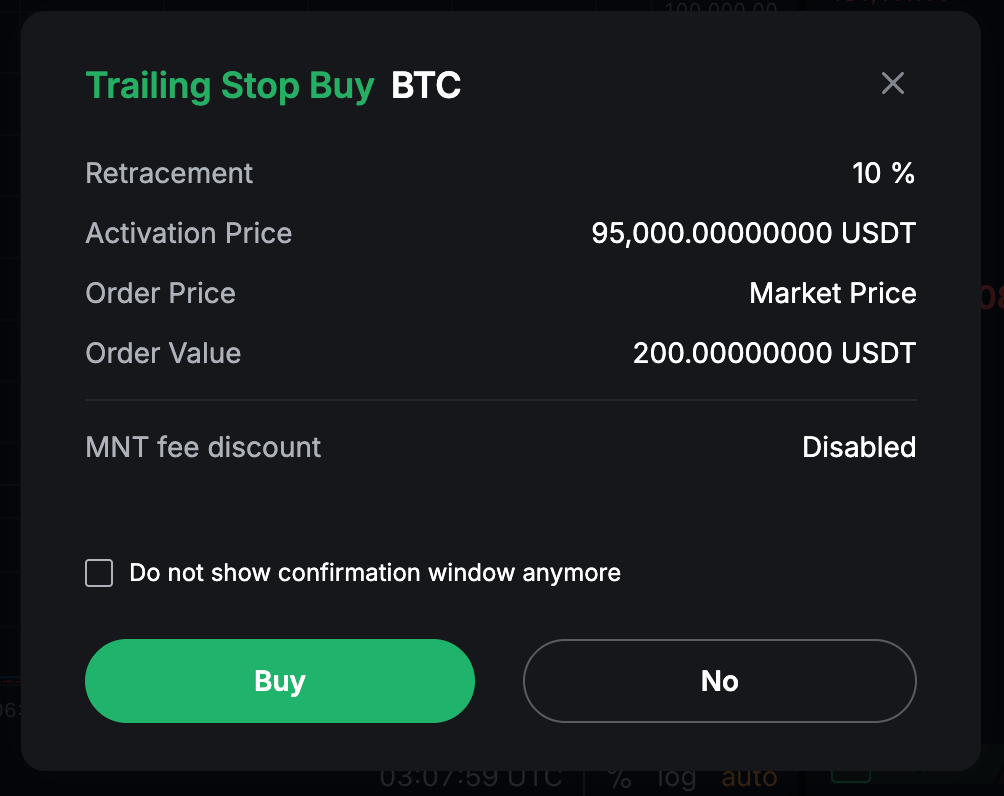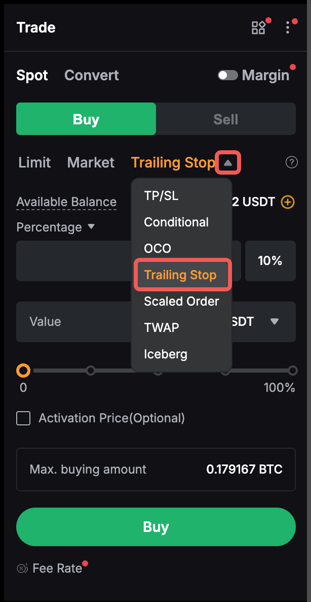 Шаг 1. Перейдите на страницу Spot Trading и выберите Trailing Stop order.