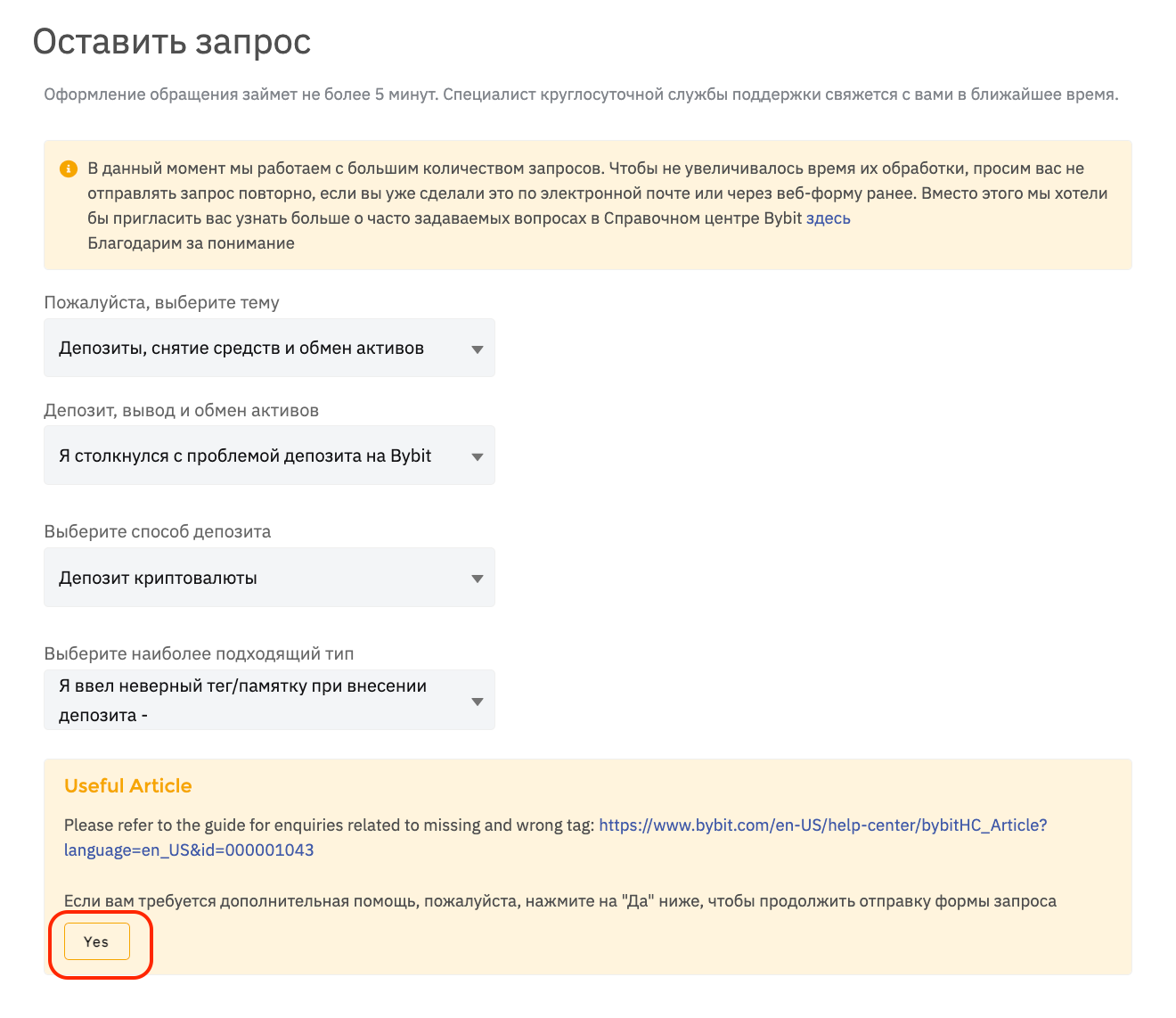 Шаг 2. Пожалуйста, отправьте форму апелляции «Депозит без тег/мемо», перейдя по этой ссылке. Обязательно ознакомьтесь с требованиями, указанными в шаге 3, прежде чем нажать Да, чтобы продолжить.