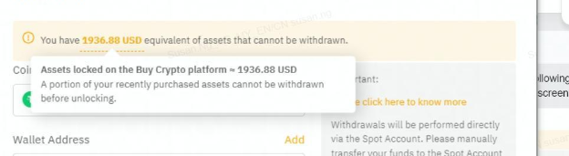 Средства, приобретённые через сервис Купить криптовалюту, могут быть временно заблокированы, если на аккаунте покупателя обнаруживаются риски или подозрительная активность. В случае такой блокировки пользователь увидит всплывающее уведомление, как показано ниже.
